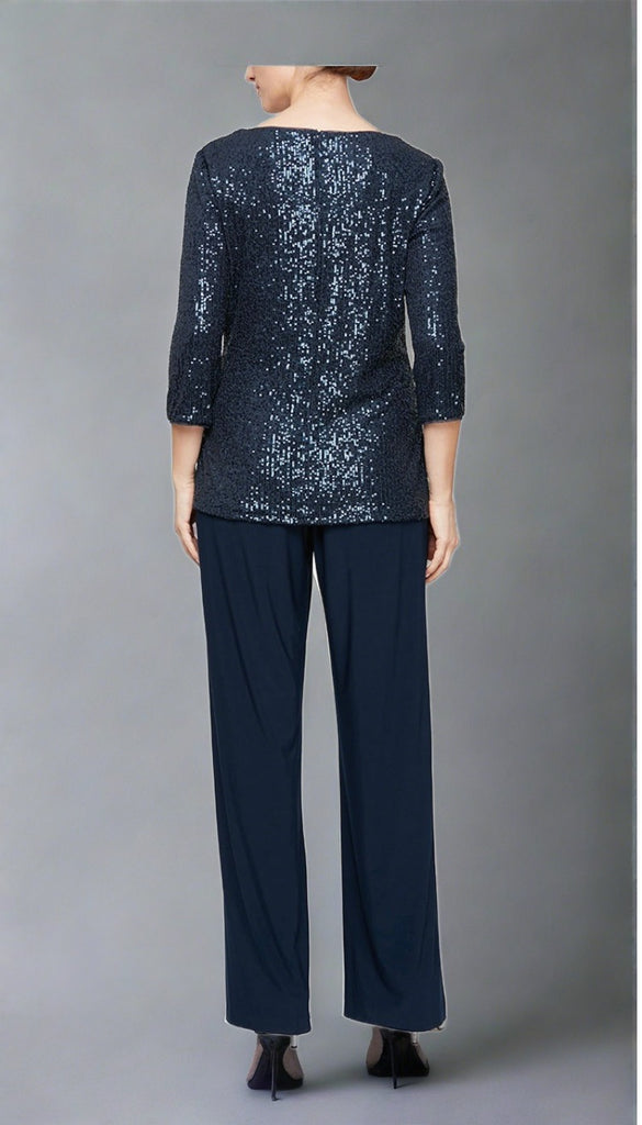 Pantsuit with Cowl Neckline Tunic Sequin 3/4 Sleeve Blouse and Straight Jersey Chiffon Pant
