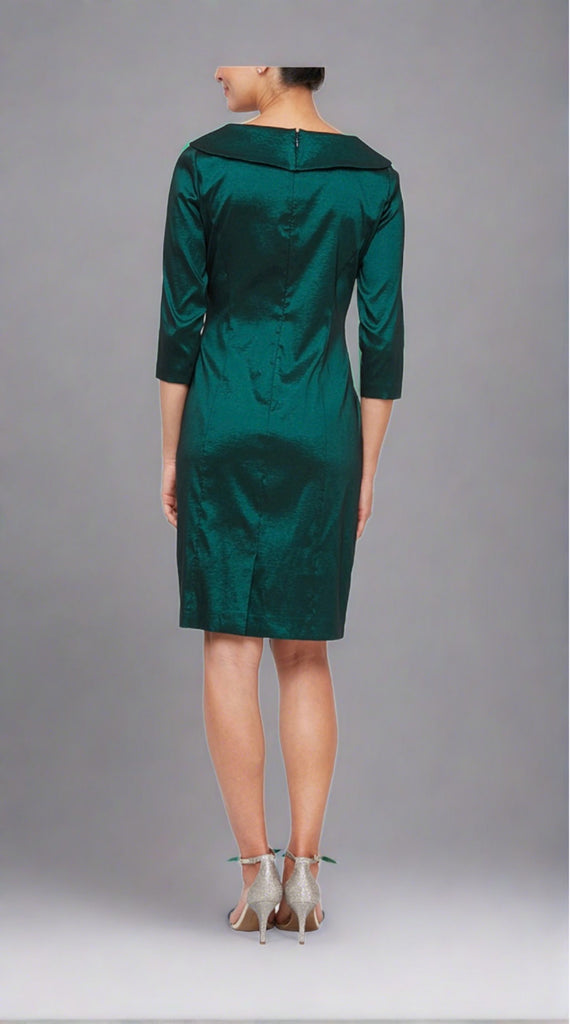 Short sheath dress with portrait collar, 3/4 sleeves and ruched waist detail