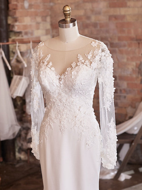 3-D floral lace sheath wedding dress with a dreamy illusion overskirt