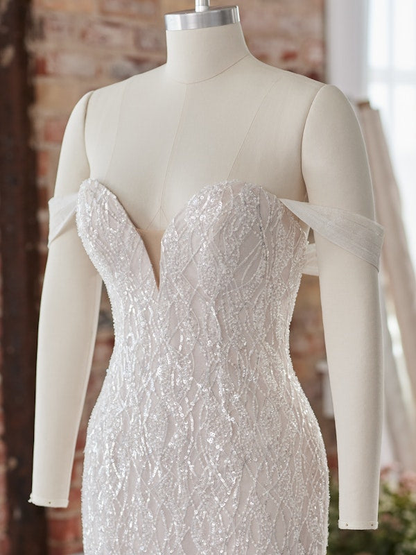 • Detachable off-the-shoulder ruched sparkle tulle cap sleeves sold separately