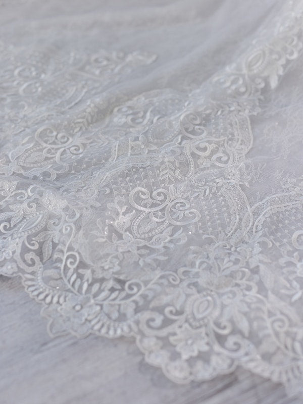 • Sequined lace motifs over texture tulle